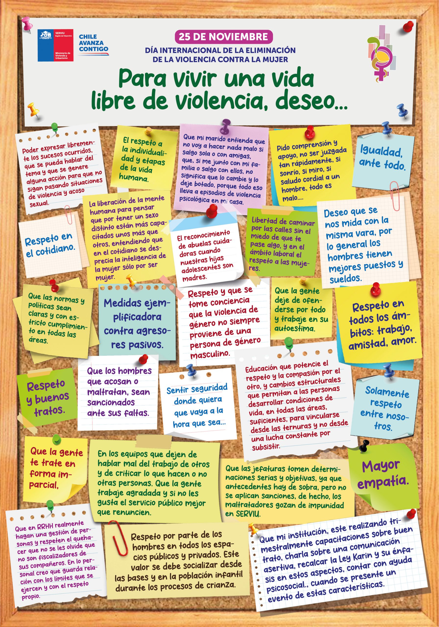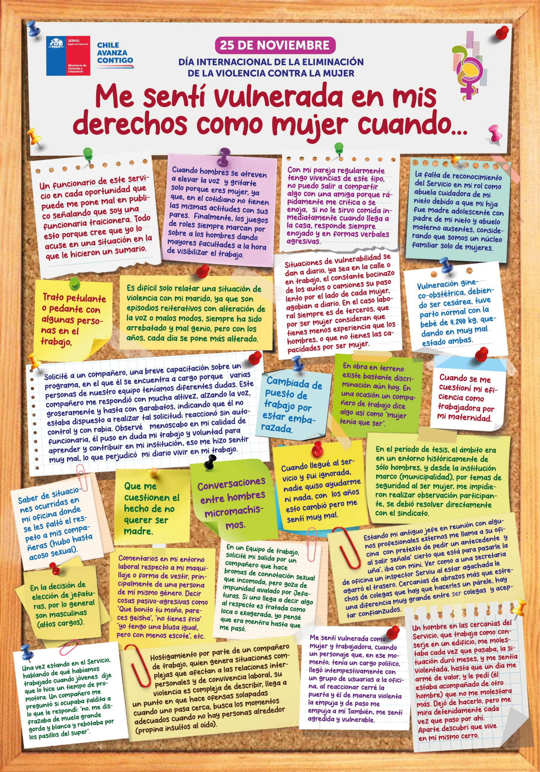 Dentro del Plan de Género de nuestro Servicio, nos hemos propuesto compilar en este banner, información que permita dar a conocer tanto interna como externamente, las acciones de difusión asociadas a la temática, desde una perspectiva de género, de manera de sensibilizar y dar conocer parte del trabajo que se genera en la Agenda de Inclusión Social y en el Programa de Mejoramiento de la Gestión (PMG) de Serviu región Valparaíso. Dentro de este banner estarán disponibles: nuestros Boletines informativos sobre Género; Información vinculada al Procedimiento de denuncia de Maltrato Laboral Acoso Laboral y Acoso Sexual (MINVU); Presentaciones de Capacitaciones de Género realizadas para sensibilizar a Funcionarias y Funcionarios en todas las materias indicadas; Datos sobre Mujeres destacadas como Líderes , entre otros aspectos relevantes.